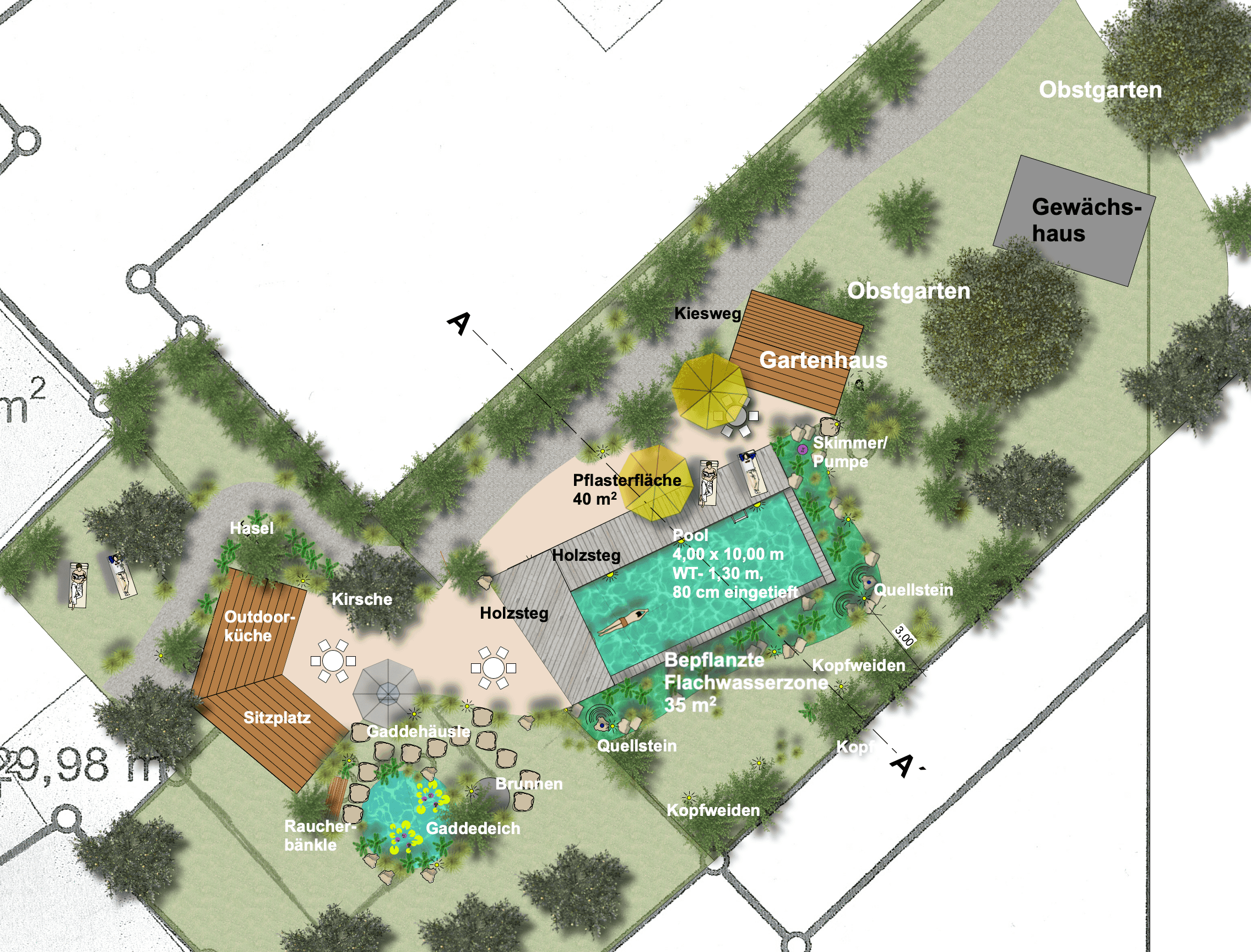 | Ausstattung Garten | Pool mit Holzterrassen, Zierteich, Quellsteine, Gartenhaus, Terrasse, Outdoorküche, überdachter Sitzplatz, Gewächshaus, Wiesenflächen |